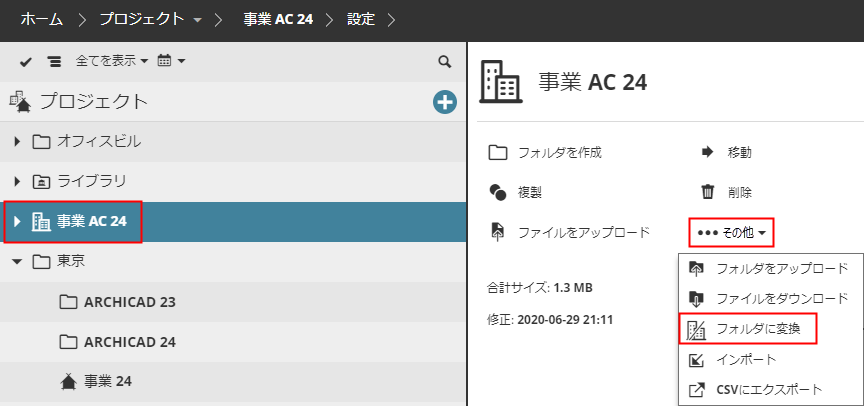 BIMcloud Managerの[プロジェクト]ページに移動します(または、ダウングレードウィザードで[確認]をクリックして、[フォルダに変換]コマンドに移動します)。