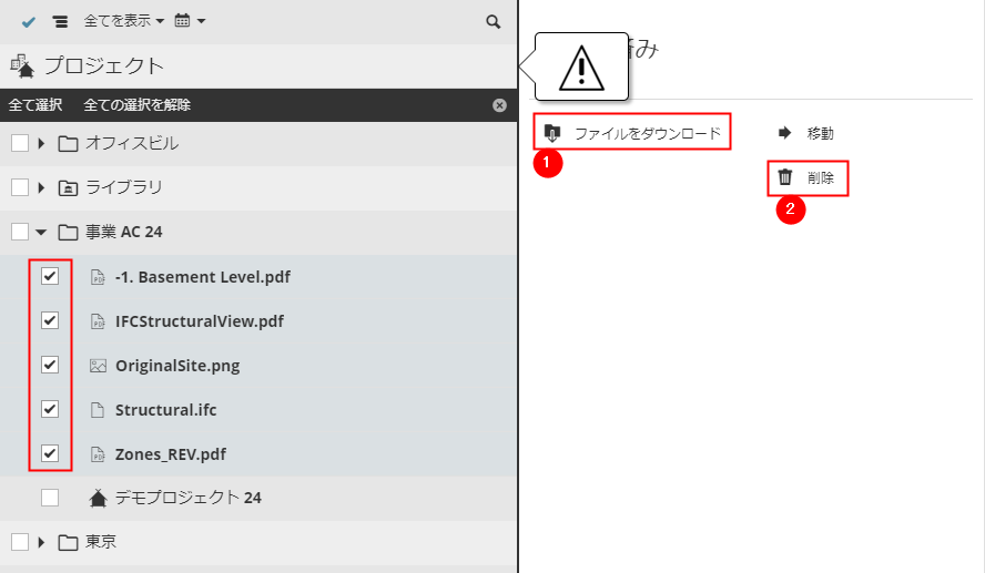 全てのアップロード済みファイルを選択して[ファイルのダウンロード]をクリックし、コピーをローカルに保存します。
