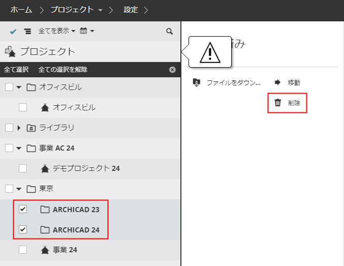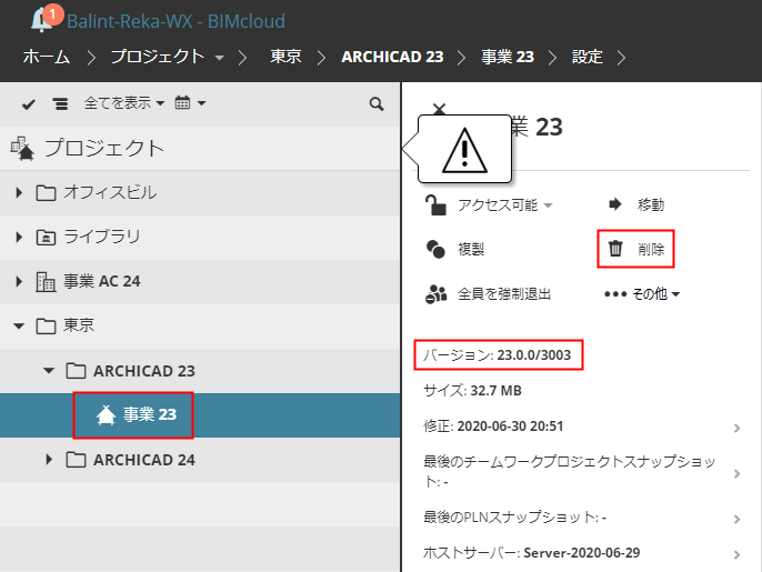 次に[削除]をクリックし、BIMcloud Managerから削除します。