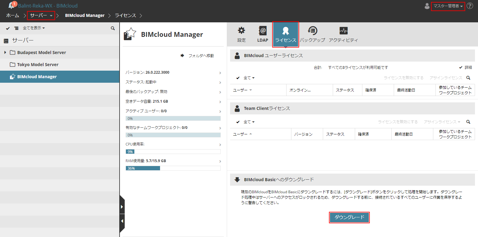 [BIMcloud Manager]→[設定]→[ステータス]に移動します(または、ダウングレードウィザードで[確認]をクリックして、そこに移動します)。