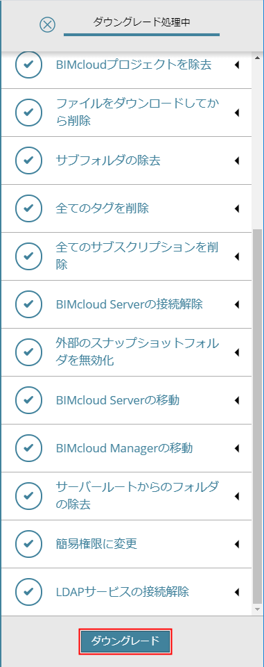 ダウングレードすると、BIMcloud Basicでは使用できない特定の機能が消失する場合があります。そのため、ダウングレード処理の一環として、特定のマネージャ定義を再設定する必要があります。