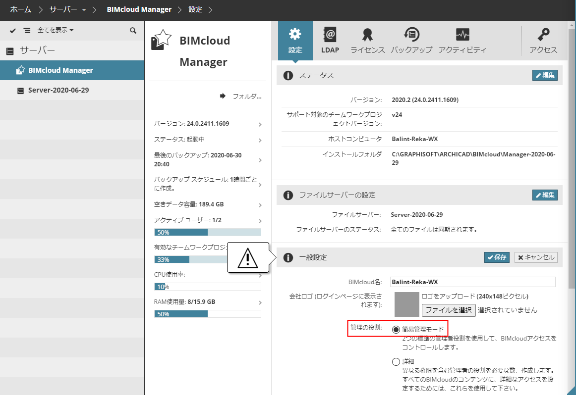 このステップが該当する場合、警告を示す赤い三角形で示されます。また、BIMcloud Managerの適切なページが自動的に表示され、そこで指示されたとおりに設定を調整できます。