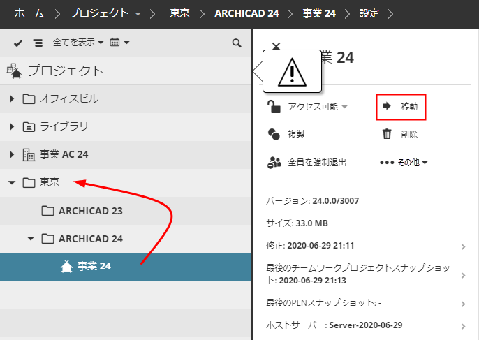 次に、BIMcloud Managerから互換性のない全てのチームワークプロジェクト、つまり、他のArchicadバージョンから共有する、全てのプロジェクトを削除する必要があります。