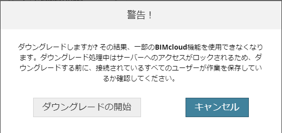 BIMcloudに接続している全てのユーザーに作業を保存するよう警告します。ダウングレード処理中はサーバーへのアクセスがロックされます。