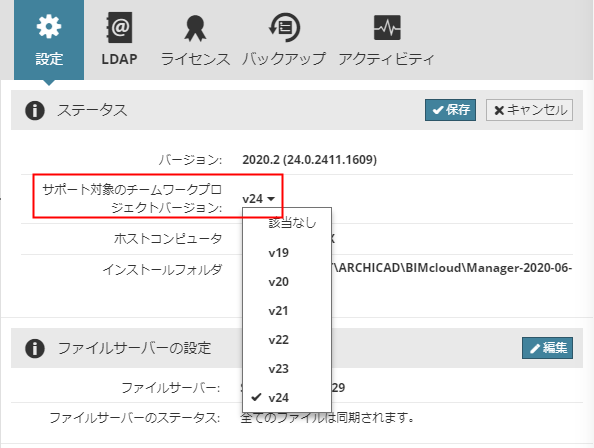 サポート対象のチームワークプロジェクトバージョン:サポートするArchicadバージョンを1つ選択します。