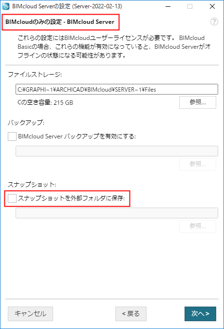 BIMcloud Basicでは、スナップショットを外部フォルダに保存するオプションは使用できません。