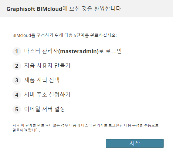 브라우저 창이 열리고 BIMcloud 설정을 완료하는 데 필요한 다음 5단계가 표시됩니다. (브라우저가 자동으로 열리지 않는다면 URL: http://localhost:PORT를 사용하십시오. 여기에서 PORT는 이 구성 페이지로 진입하는 포트를 의미합니다.)
