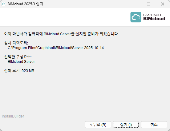 이제 마법사가 BIMcloud Server를 설치할 준비가 완료되었습니다.