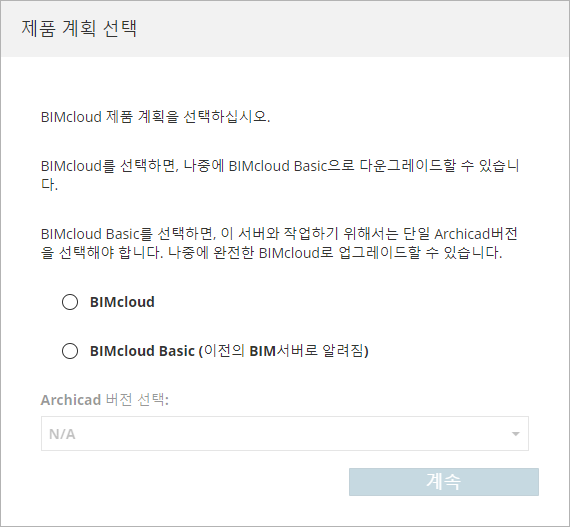 - 제품 플랜 선택 - 전체 BIMcloud 또는 BIMcloud Basic