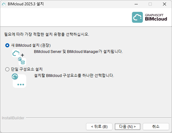 - 새 BIMcloud 설치를 선택합니다. 이제 두 가지 구성요소를 차례로 설치하고 구성하게 됩니다: