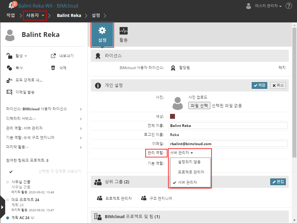 BIMcloud Manager의 사용자 페이지로 갑니다.