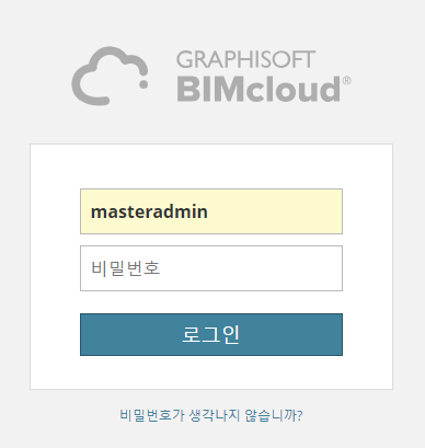 마스터 관리자에 대한 로그인 이름은 masteradmin입니다. 비밀번호는 BIMcloud Manager 구성에서 서버를 설치할 때 정의됩니다. 비밀번호를 분실한 경우 BIMcloud Manager 구성을 다시 실행하고 새 비밀번호를 정의합니다.