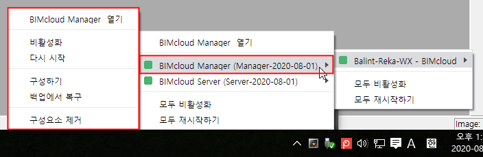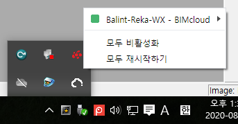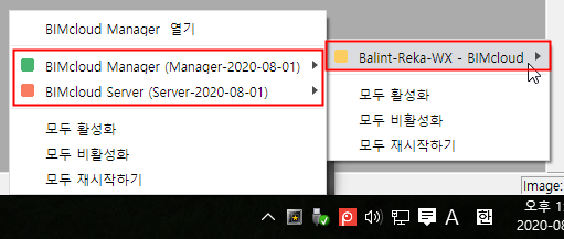 설치된 BIMcloud 구성요소 및 관련 명령에 액세스하려면 트레이 아이콘을 클릭하십시오. BIMcloud는 이름으로 구분됩니다. (BIMcloud 이름은 BIMcloud Manager - 일반 설정에 표시됩니다.)