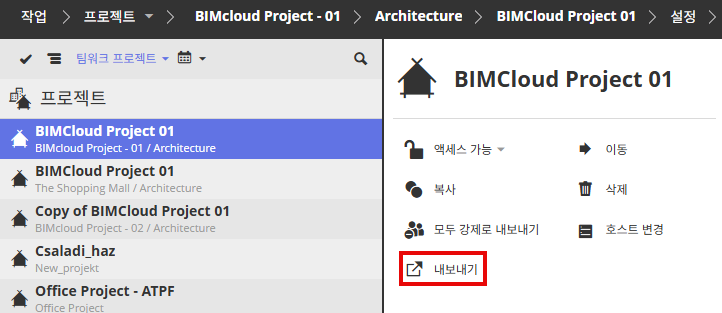 이 기능은 팀워크 프로젝트 또는 라이브러리를 파일 형식 .BIMProject 또는 .BIMLibrary로 컴퓨터에 다운로드할 수 있습니다.