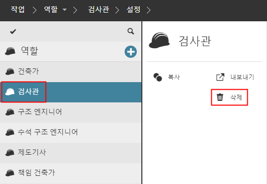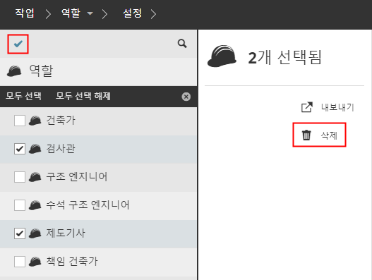 역할 삭제하기 BIMcloud에서 하나 이상의 역할 제거하기 삭제 할 하나 또는 그 이상의 역할을 선택합니다. 주: 내비게이터에서 항목을 여러 개 선택하려면 페이지 상단의 체크마크를 클릭하여 체크박스를 활성화합니다. 상위 주제: BIMcloud 역할 관리하기