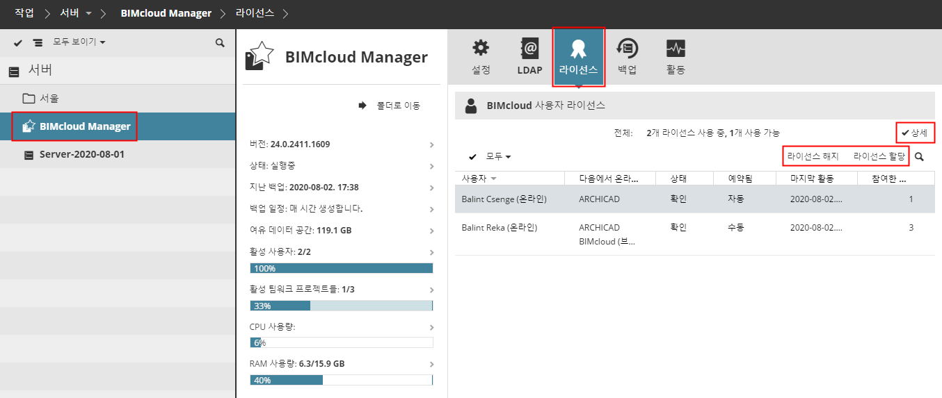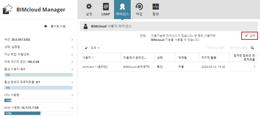 BIMcloud의 모든 라이선스에 대한 개요 정보를 보려면 세부 정보 버튼을 클릭하세요: