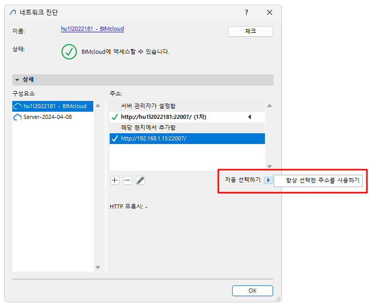 Archicad는 향후 이 대체 주소를 기억하고 서버에 연결 시 검색 순서에서 이 주소를 사용하게 됩니다.