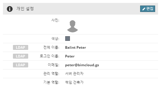 사용자 정의 필드를 정의한 경우 개인 설정 섹션에도 표시됩니다. (선택적 사용자 정의 필드는 BIMcloud Manager 설정에서, 서버 페이지 상에서 서버 관리자가 정의합니다.)