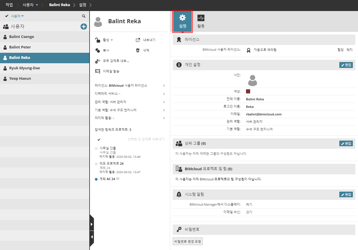 선택한 사용자의 설정 패널에서 라이선스와 개인 설정, 비밀번호를 설정하세요: