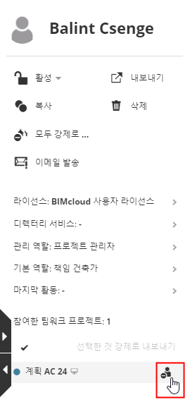 참여한 팀워크 프로젝트 목록에서, 프로젝트 이름에 커서를 대어 디스플레이되는 강제로 내보내기 아이콘을 클릭합니다.