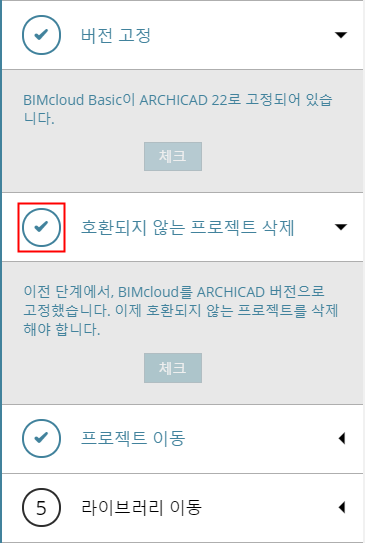 BIMcloud Manager의 프로젝트 페이지로 갑니다. (또는 다운그레이드 마법사에서 체크를 클릭하여 갑니다.)