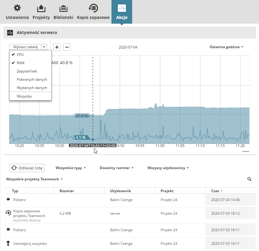 Aktywność BIMcloud Server zostanie pokazana pod wykresem.