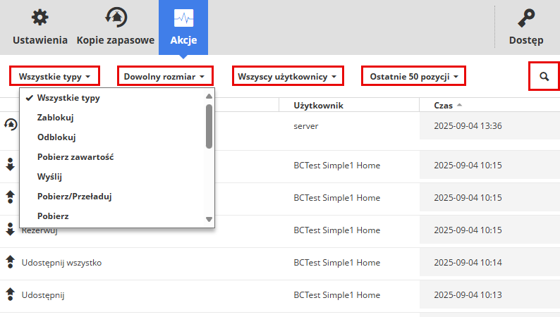 Użytkownik: Wybierz użytkownika z listy aby wyświetlić wyłącznie działania związane z tym użytkownikiem.