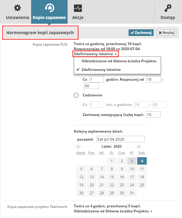 Zaplanuj automatyczne wykonywanie Migawek w panelu Migawki, na poziomie katalogu głównego Projektów, dowolnego folderu lub pojedynczego projektu Teamwork.