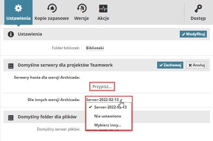 W przypadku wszystkich innych wersji Archicada (do których nie przypisano określonego serwera hosta): użyj domyślnego lub kliknij wyskakujące okienko, aby przypisać inny serwer hosta.