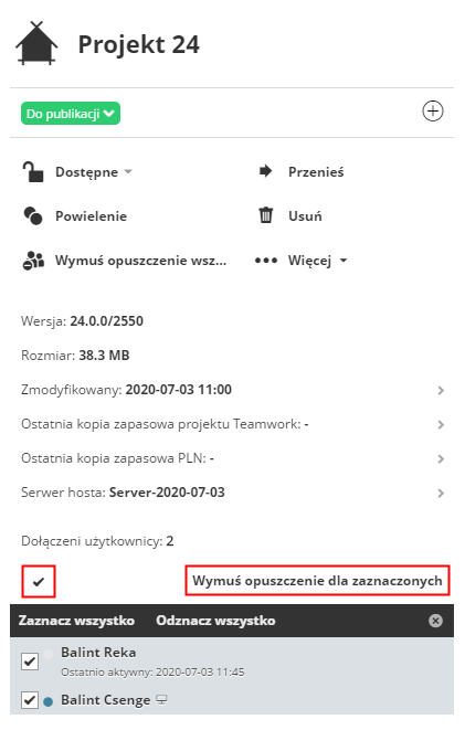 Zaznacz użytkowników, dla których ma zostać zastosowane Wymuszone opuszczenie projektu: Przycisk “Wymuś opuszczenie dla zaznaczonych” jest aktywny.