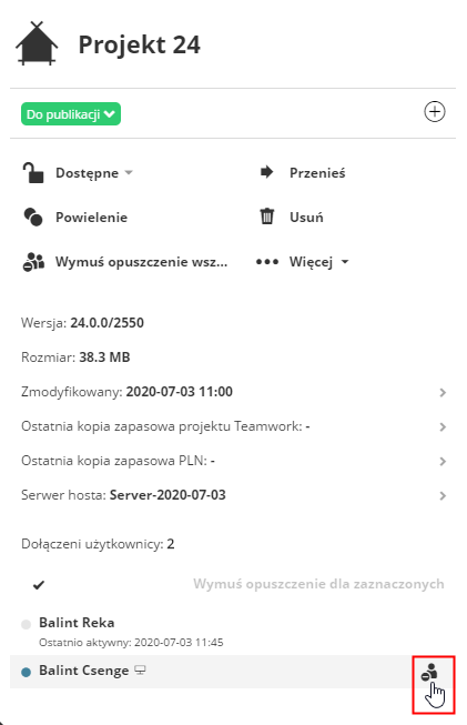 Uwaga: Wymuszenie opuszczenia przez użytkownika odbywa się natychmiastowo; użytkownik nie będzie mógł wysłać swoich zmian. Użytkownik, na którym zostało wymuszone opuszczenie, może ponownie dołączyć do projektu od razu, bez żadnych ograniczeń. Jeśli nie chcesz, aby użytkownik ponownie dołączył do projektu, można cofnąć jego uprawnienia w panelu uprawnień projektu.