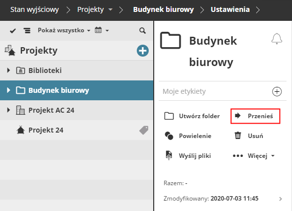 Funkcja Przenieś jest dostępna na stronie Projekty BIMcloud dla wszystkich elementów z wyjątkiem katalogu głównego projektu.