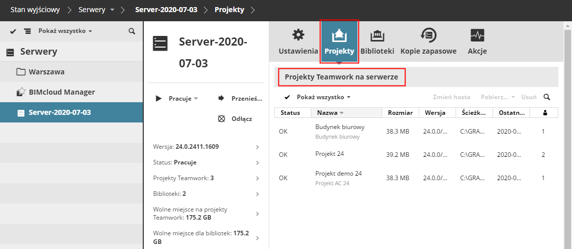 Strona serwerów, panele projektów i bibliotek są dostępne dla każdego wybranego BIMcloud Server lub folderu.