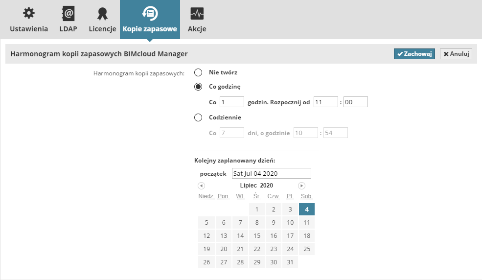 Funkcja kopii zapasowej BIMcloud Server i/lub BIMcloud Managera może być włączona tylko, jeśli: