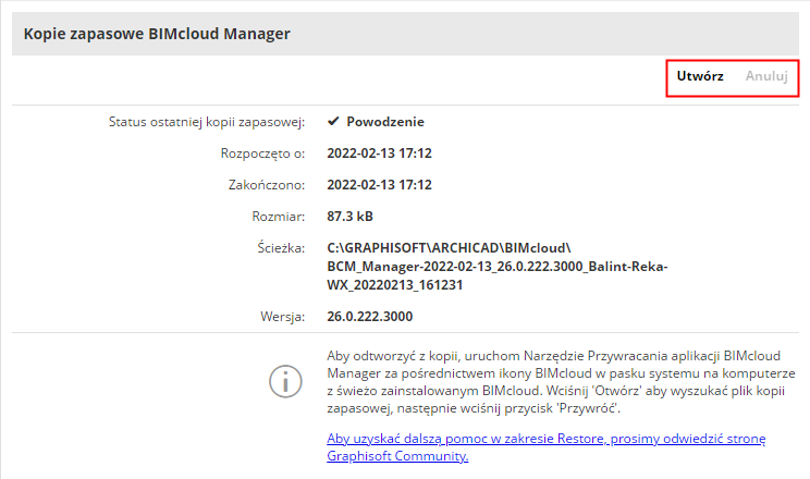 Jednocześnie przechowywana jest tylko jedna kopia każdego rodzaju kopii zapasowej (BIMcloud Manager i BIMcloud Server). Jeśli proces tworzenia kopii zapasowej się nie powiedzie, do momentu utworzenia nowej, która ją zastąpi, zachowana zostanie ostatnia kopia zapasowa.