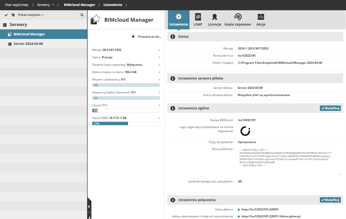 Kluczowe dane wybranego serwera BIMcloud lub serwera BIMcloud Manager