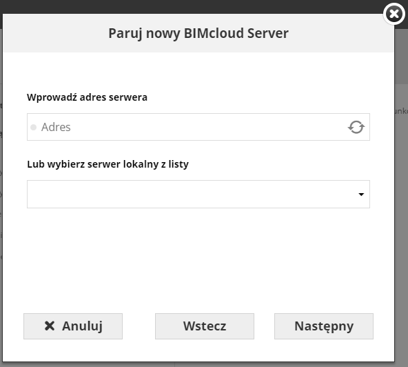 Wróć do Interfejsu internetowego: okno dialogowe Paruj nowy serwer BIMcloud Server.