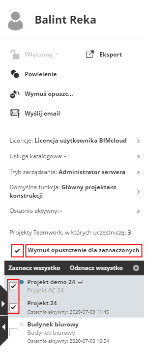 Wymuś opuszczenie przez użytkownika/użytkowników wszystkich projektów Teamwork