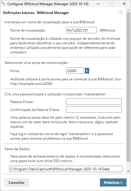- Password do Administrador Mestre: Crie uma password segura para o utilizador Administrador Mestre (adminmestre). O Administrador Mestre poderá sempre aceder com acesso total a todos os dados alojados. Caso se esqueça da password, tem de reconfigurar o seu BIMcloud e introduzir uma nova password.