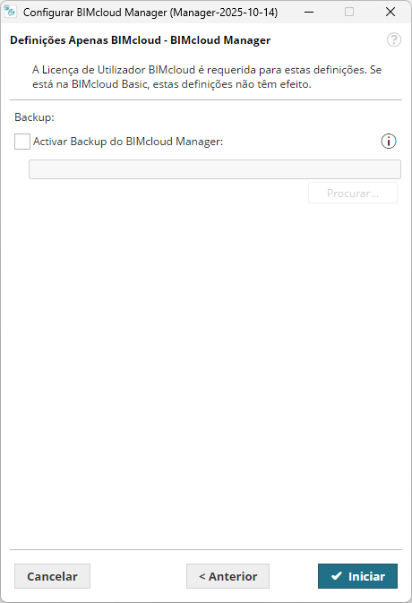 - Activar Backup do BIMcloud Manager: Assinale esta opção se estiver a planear criar cópias de dados do BIMcloud Manager. Depois de assinalar a opção, tem de introduzir (ou procurar) o caminho para a localização da pasta de backups.