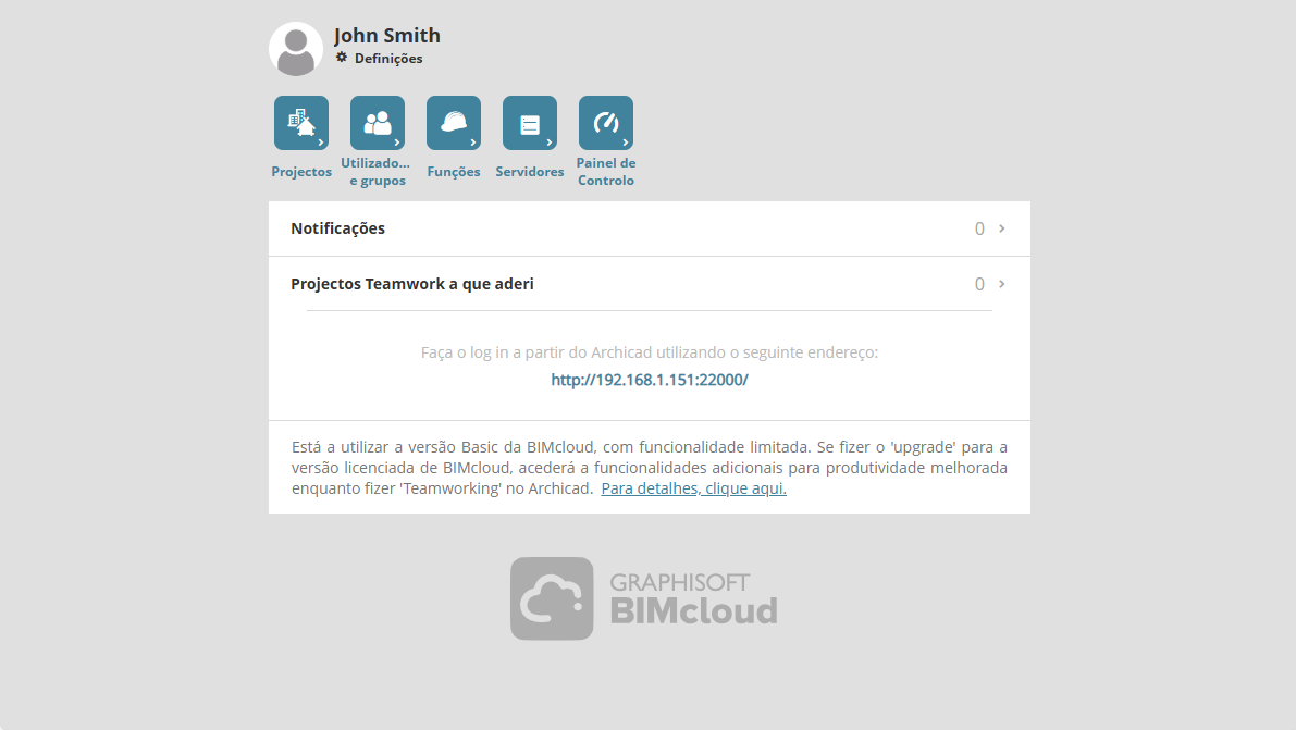 Pode abrir a interface web do BIMcloud Manager a partir de qualquer computador com acesso de rede ao BIMcloud. Dispõe das seguintes opções: