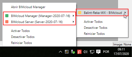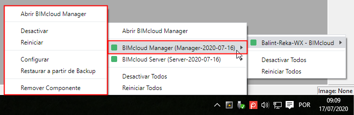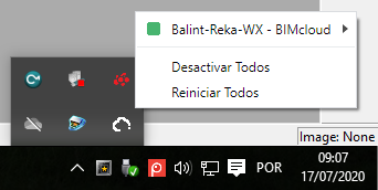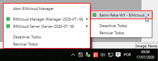 Use a aplicação do ícone do tabuleiro BIMcloud para verificar e controlar o estado dos componentes BIMcloud instalados. A aplicação é instalada e iniciada de forma automática no computador servidor.
