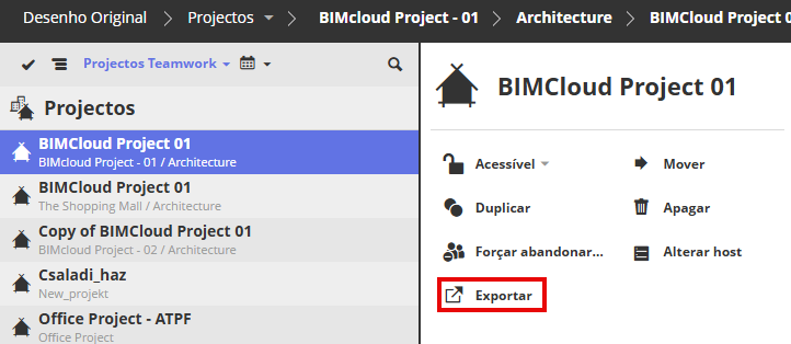Esta função descarrega um Projecto Teamwork ou Biblioteca para o seu computador, com formato de ficheiro .BIMProject ou .BIMLibrary).