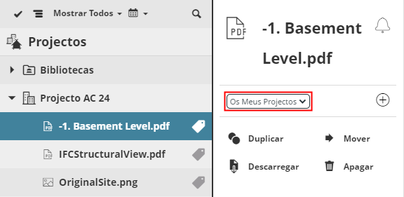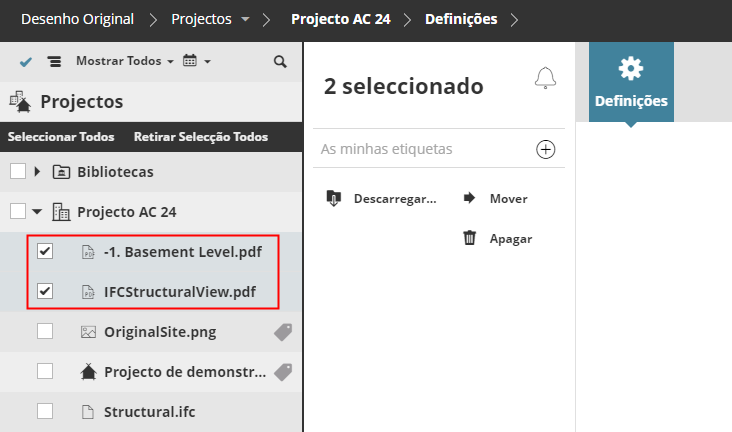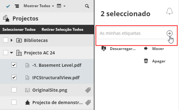 Itens etiquetáveis são todos os listados na página de Projectos BIMcloud: Projectos Teamwork, Projectos BIMcloud, Bibliotecas, pastas e ficheiros carregados.