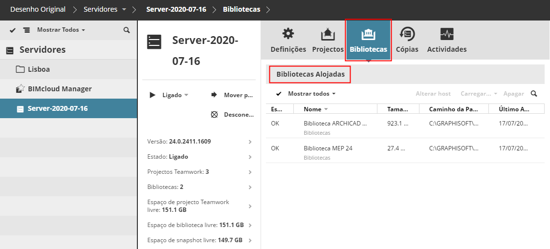 Na página Servidores, os painéis Projectos e Bibliotecas estão disponíveis para um BIMcloud Server ou uma pasta seleccionado(a).