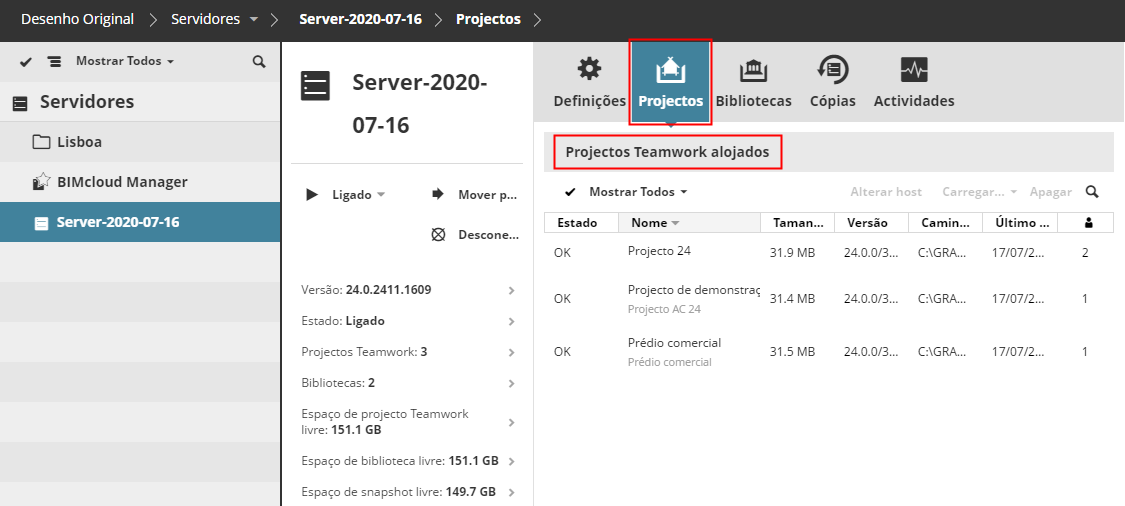 O BIMcloud Manager e BIMcloud Server são componentes diferentes. Um(a) projecto/biblioteca listado(a) no BIMcloud Manager também tem de ter dados de um projecto ou de uma biblioteca vinculados disponíveis no Servidor. O contrário também se aplica: os dados alojados no Servidor têm de ser vinculados a uma entidade de projecto/biblioteca no BIMcloud Manager.