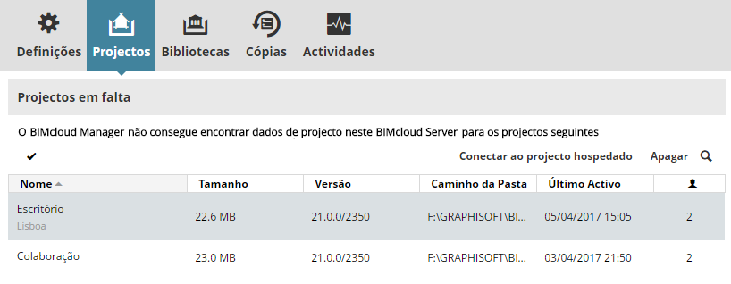 Se o BIMcloud Manager recorrer a um projecto/biblioteca num Servidor, mas o projecto/biblioteca já não estiver lá, então ele é listado(a) na secção Projectos ou Bibliotecas em falta.