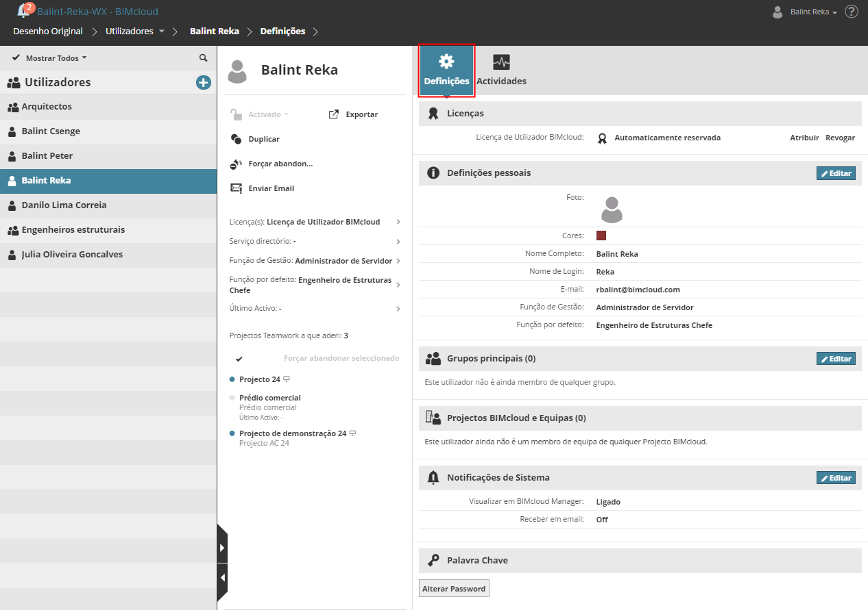 Secção Projectos BIMcloud e Equipas