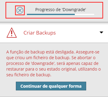 Para abortar o processo de Downgrade, clique em X na barra de progresso, na parte superior do Assistente.