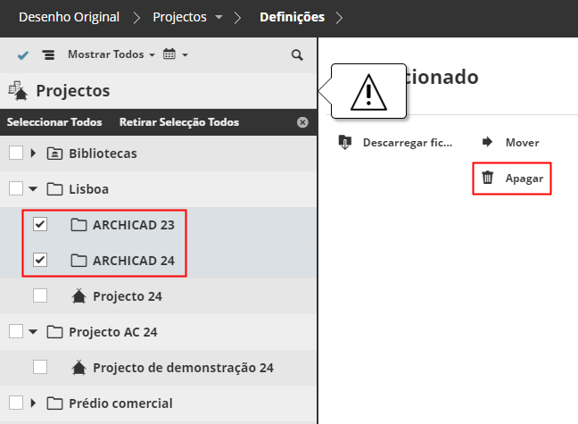A seguir clique em Apagar para removê-las do BIMcloud Manager.